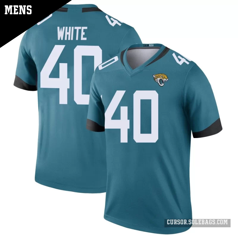 Keep cool and comfortable while backing the Jacksonville Jaguars in this Men's Jacksonville Jaguars #40 Aydan White Teal Legend Color Rush Jersey. Lightweight, breathable fabric and bold player graphics make it perfect for warmer game days and everyday wear.