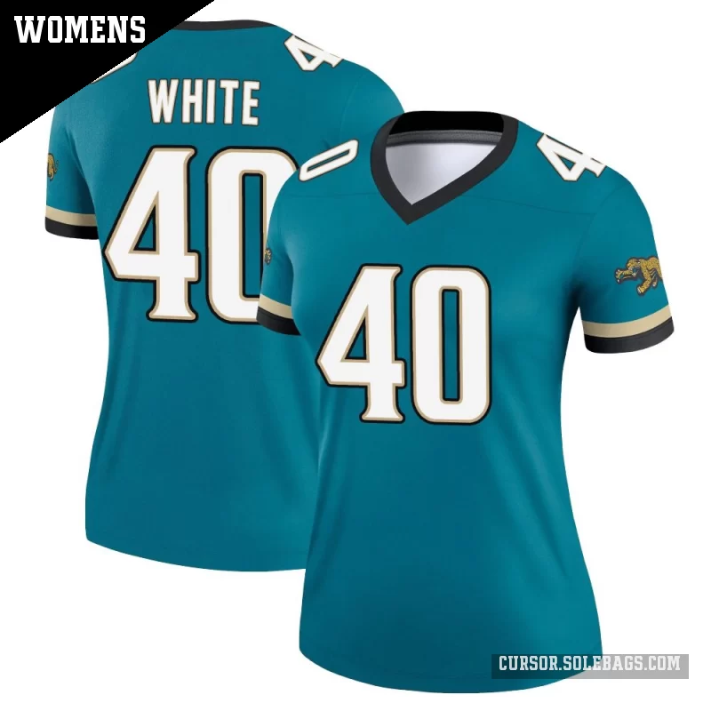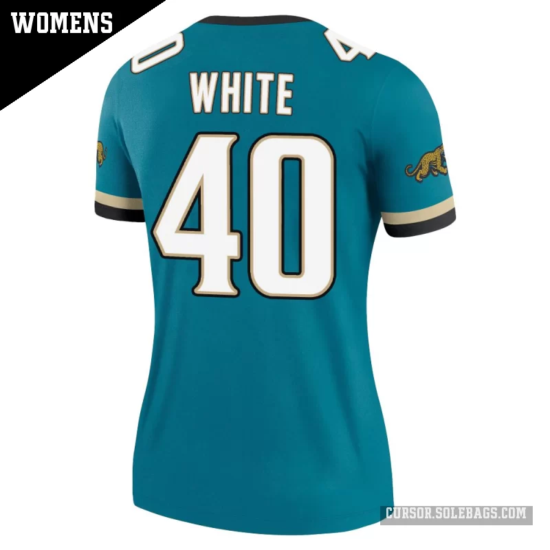 Stay light, cool, and game-ready in this Women's Jacksonville Jaguars #40 Aydan White Teal Legend Prowler Throwback Jersey. With a comfortable fit and crisp player details, it's ideal for stadium seats, watch parties, or casual outfits.