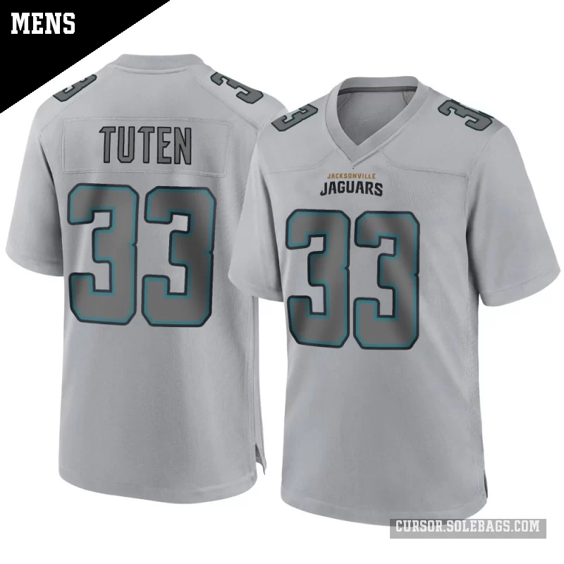 Suit up like a fan favorite in this Men's Jacksonville Jaguars #33 Bhayshul Tuten Gray Game Atmosphere Fashion Jersey. Featuring graphics and a comfortable everyday fit, it's perfect for cheering in the stands or watching from home.
