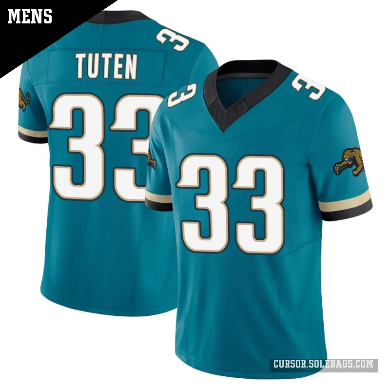Step up your fan gear with this Men's Jacksonville Jaguars #33 Bhayshul Tuten Teal Limited Prowler Throwback Vapor F.U.S.E. Jersey. Featuring premium fabrics, stitched details, and a tailored fit, it delivers a more authentic on-field look for serious supporters.