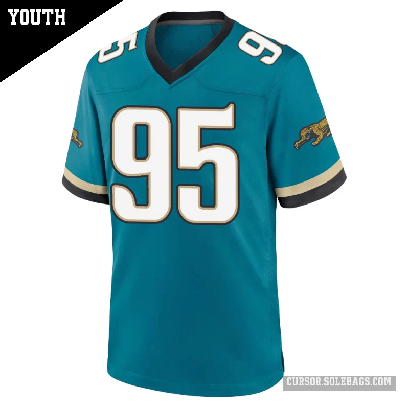 Let young fans feel part of the team with this Youth Jacksonville Jaguars #95 B.J. Green II Teal Game Prowler Throwback Jersey. Durable, comfortable, and full of team spirit, it's great for school, backyard play, and every big game.