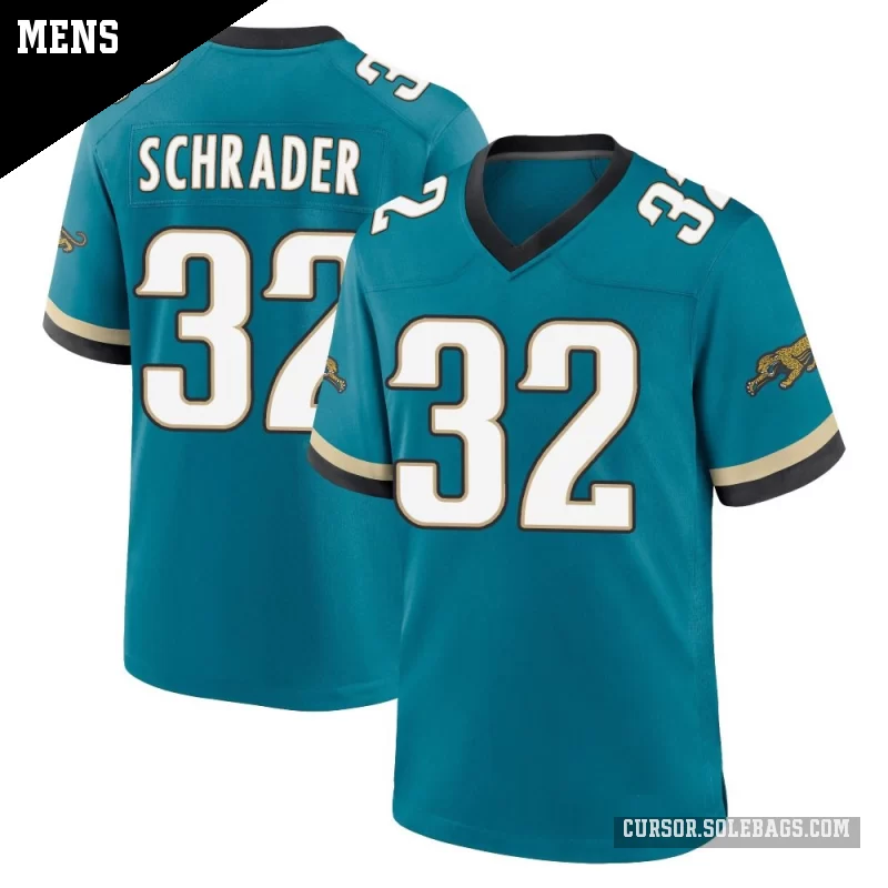 Suit up like a fan favorite in this Men's Jacksonville Jaguars #32 Cody Schrader Teal Game Prowler Throwback Jersey. Featuring graphics and a comfortable everyday fit, it's perfect for cheering in the stands or watching from home.