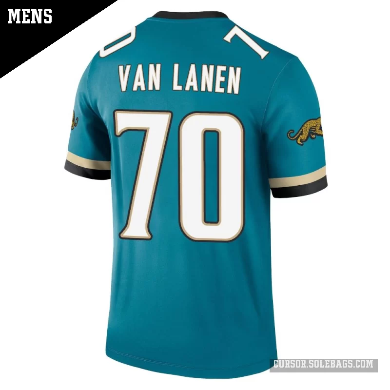 Keep cool and comfortable while backing the Jacksonville Jaguars in this Men's Jacksonville Jaguars #70 Cole Van Lanen Teal Legend Prowler Throwback Jersey. Lightweight, breathable fabric and bold player graphics make it perfect for warmer game days and everyday wear.