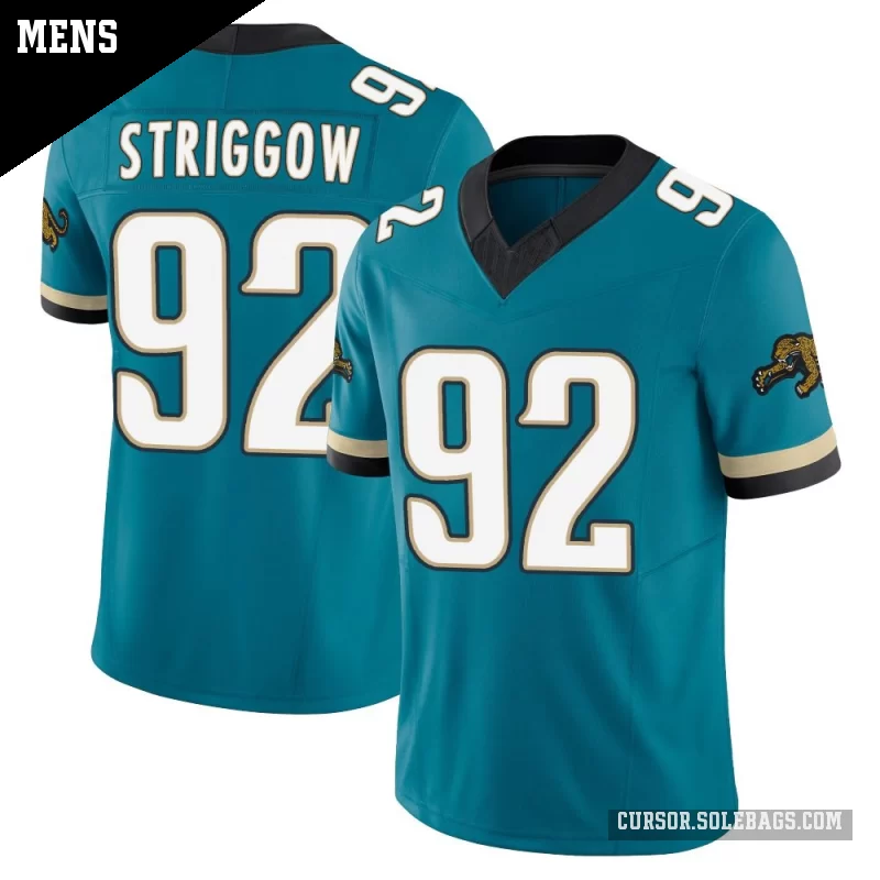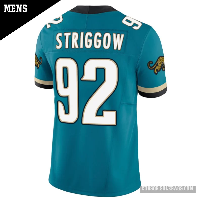 Step up your fan gear with this Men's Jacksonville Jaguars #92 Danny Striggow Teal Limited Prowler Throwback Vapor F.U.S.E. Jersey. Featuring premium fabrics, stitched details, and a tailored fit, it delivers a more authentic on-field look for serious supporters.