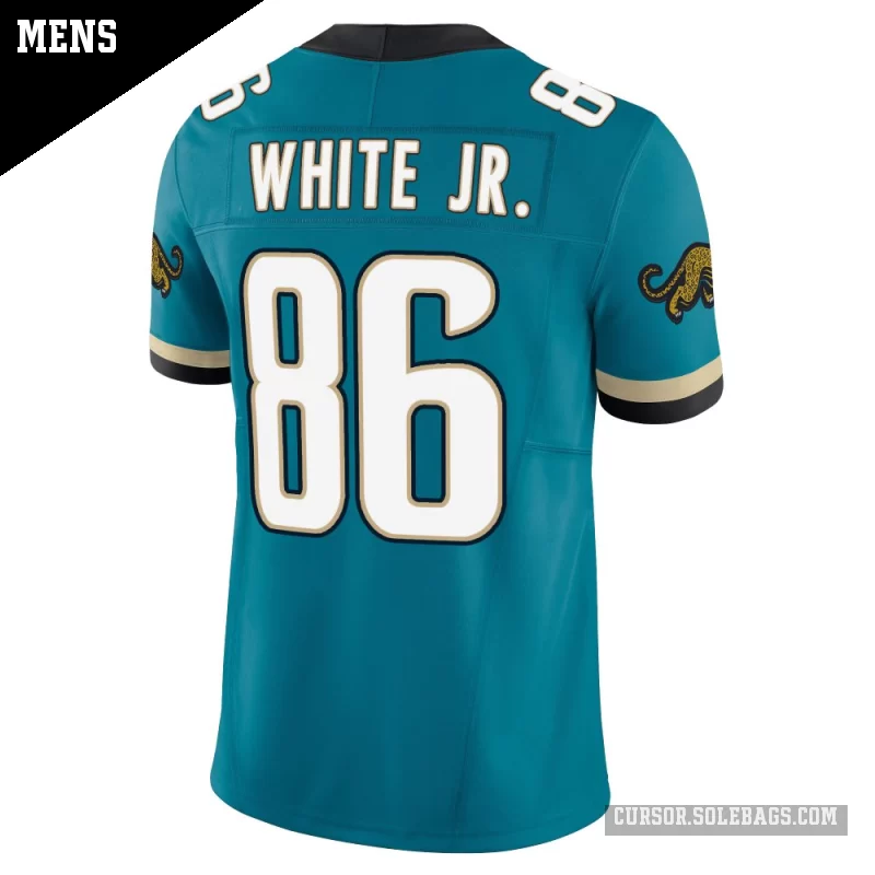Step up your fan gear with this Men's Jacksonville Jaguars #86 David White Jr. Teal Limited Prowler Throwback Vapor F.U.S.E. Jersey. Featuring premium fabrics, stitched details, and a tailored fit, it delivers a more authentic on-field look for serious supporters.