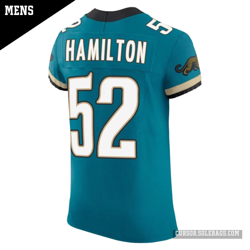 Experience game-day like the pros in this Men's Jacksonville Jaguars #52 DaVon Hamilton Teal Elite Prowler Throwback Vapor F.U.S.E. Jersey. Built with top-tier materials, advanced ventilation, and authentic on-field details, it's the ultimate choice for dedicated collectors and superfans.