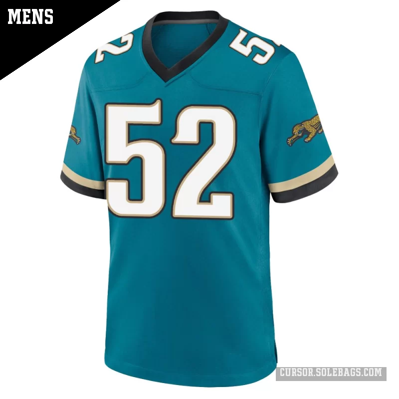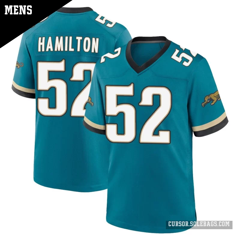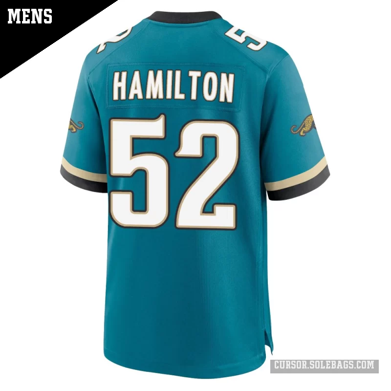 Suit up like a fan favorite in this Men's Jacksonville Jaguars #52 DaVon Hamilton Teal Game Prowler Throwback Jersey. Featuring graphics and a comfortable everyday fit, it's perfect for cheering in the stands or watching from home.