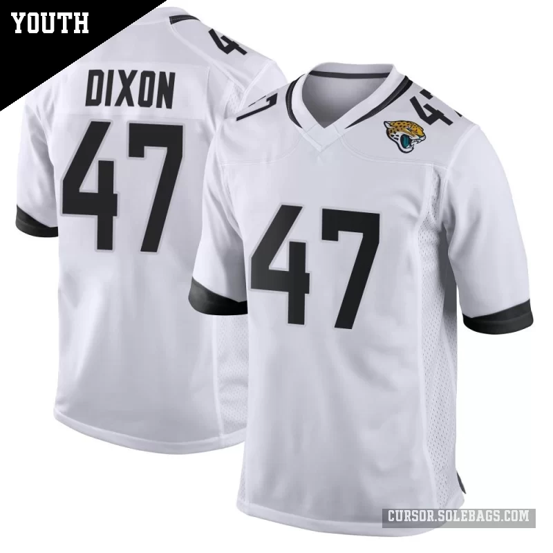 Let young fans feel part of the team with this Youth Jacksonville Jaguars #47 De'Shaan Dixon White Game Jersey. Durable, comfortable, and full of team spirit, it's great for school, backyard play, and every big game.