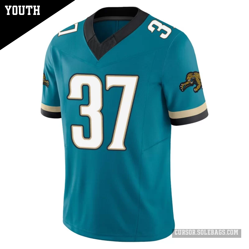 Treat young fans to a more premium feel with this Youth Jacksonville Jaguars #37 Jabbar Muhammad Teal Limited Prowler Throwback Vapor F.U.S.E. Jersey. Enhanced details and a comfortable fit make it a standout choice for special games, photos, and gifts.
