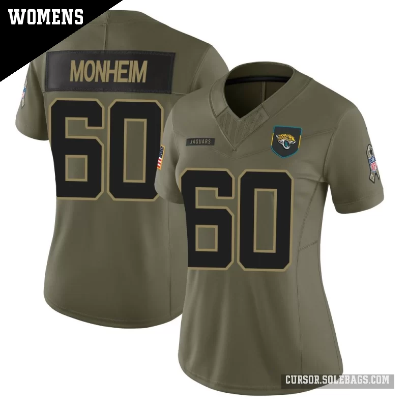 - Women's Jacksonville Jaguars #60 Jonah Monheim Olive Limited 2025 Salute to Service Jersey