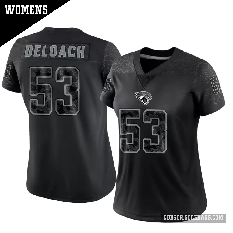 Elevate your game-day style in this Women's Jacksonville Jaguars #53 Kalen DeLoach Black Limited Reflective Jersey. With upgraded materials and refined detailing, it offers a more polished, high-end fan look without sacrificing comfort.
