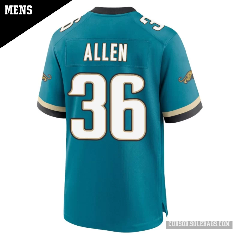 Suit up like a fan favorite in this Men's Jacksonville Jaguars #36 LeQuint Allen Teal Game Prowler Throwback Jersey. Featuring graphics and a comfortable everyday fit, it's perfect for cheering in the stands or watching from home.