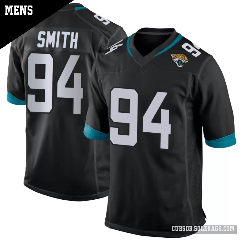 Suit up like a fan favorite in this Men's Jacksonville Jaguars #94 Maason Smith Black Game Jersey. Featuring graphics and a comfortable everyday fit, it's perfect for cheering in the stands or watching from home.
