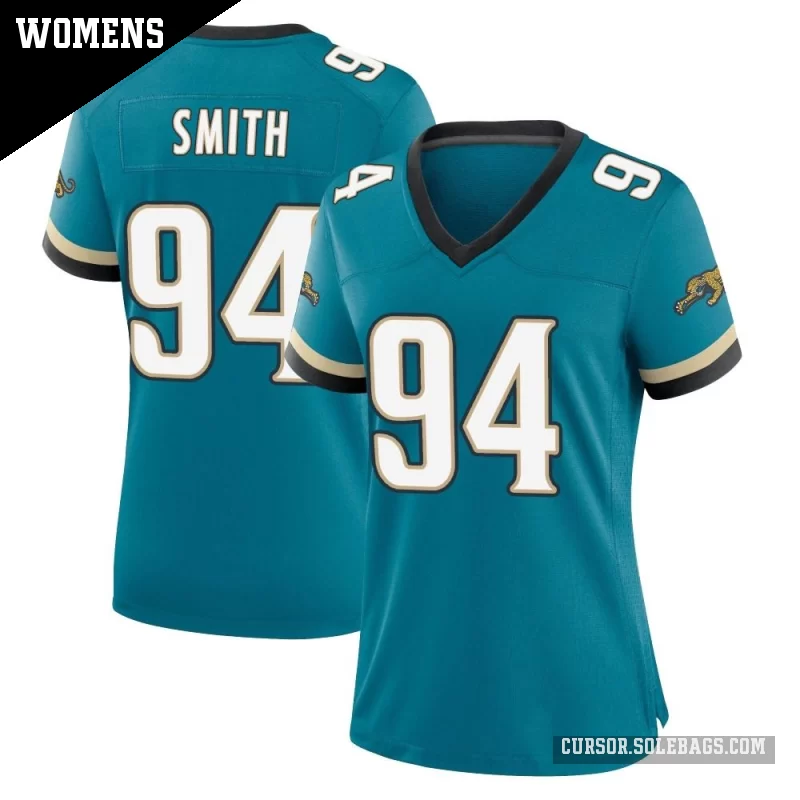 Bring true fan energy to every game with this Women's Jacksonville Jaguars #94 Maason Smith Teal Game Prowler Throwback Jersey. Designed for comfort and a flattering silhouette, it's an easy go-to for any game-day outfit.