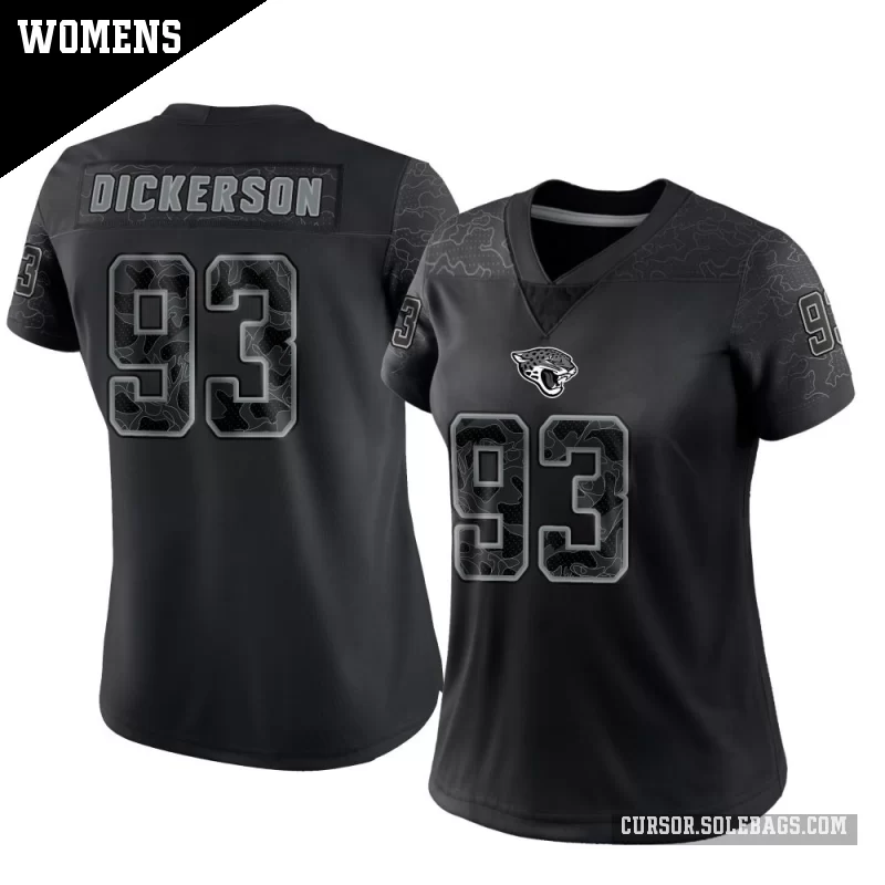 Elevate your game-day style in this Women's Jacksonville Jaguars #93 Matt Dickerson Black Limited Reflective Jersey. With upgraded materials and refined detailing, it offers a more polished, high-end fan look without sacrificing comfort.