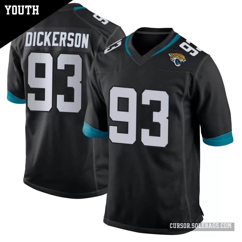 Let young fans feel part of the team with this Youth Jacksonville Jaguars #93 Matt Dickerson Black Game Jersey. Durable, comfortable, and full of team spirit, it's great for school, backyard play, and every big game.