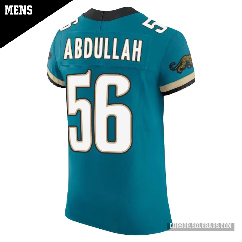 Experience game-day like the pros in this Men's Jacksonville Jaguars #56 Yasir Abdullah Teal Elite Prowler Throwback Vapor F.U.S.E. Jersey. Built with top-tier materials, advanced ventilation, and authentic on-field details, it's the ultimate choice for dedicated collectors and superfans.